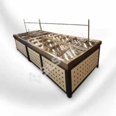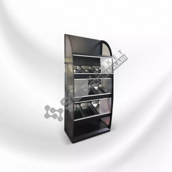 Müşterilerimize tam kapsamlı ürünler sunmaktayız: Tente gölgelik ya da aynalı zengin sunum, dayanıklı raflar, tel raflar, paslanmaz çelik raflar ve hem iç hem de dış alan dökme ürün sergilenecek stand çeşitleri